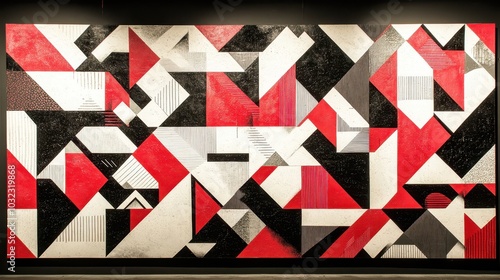 Complex geometric mural in bold colors overlapping squares and triangles in red black and white