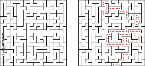 Complex maze solution illustrated with a clear red path for navigational guidance