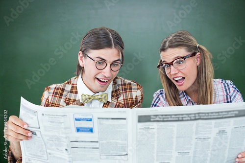 Composite image of geeky hipsters reading the newspaper