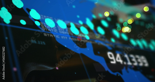 Composition of data processing with numbers over world map and cityscape