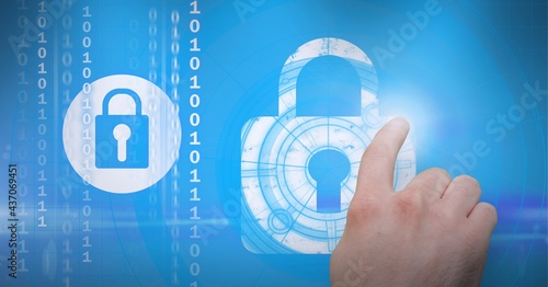 Composition of man touching online security icon over binary coding