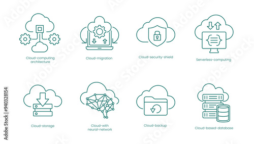 Comprehensive Cloud Computing Vector Icons Set: Architecture, Migration, Security Shield, Serverless, Storage, Neural Network, Backup, Database