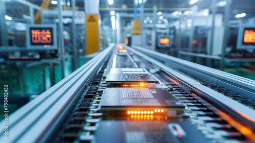 computer chips assembly line in manufacturing plant, modern electronics production factory