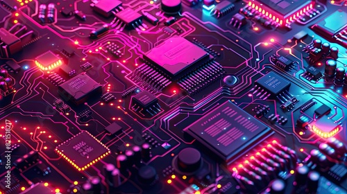 computer circuit board with chips and transistors, neon style.