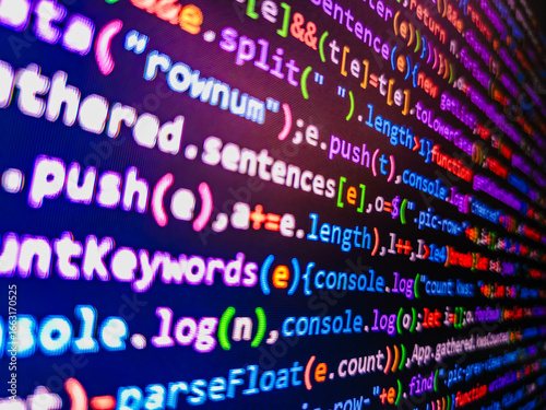 Computer code background. Colorful programming source typed on the screen of the monitor with shallow focus effect. Modern technology and futuristic concept abstract visualization of software.