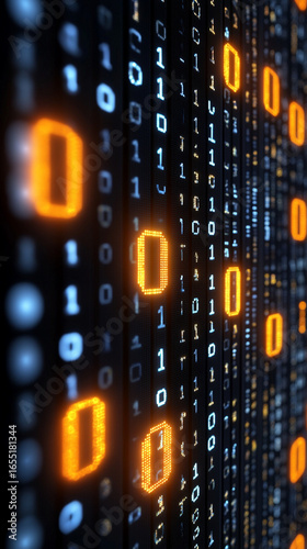 Computer code concept with 3d digital binary code background, futuristic technology theme, abstract data visualization, ideal for tech, programming, and digital projects.