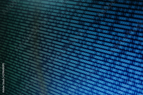 computer data matrix. vertical digital binary code moving motion downward. light up blue one and zero text flowing down. black background space with multiple layers coding.
