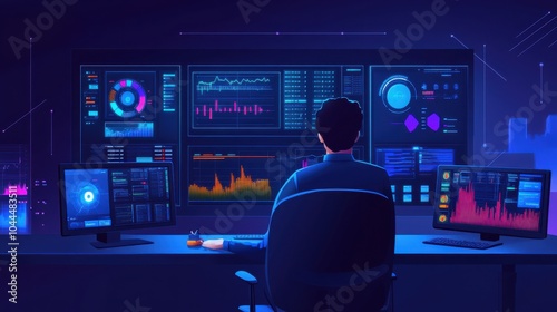 Computer Data Science Engineer Work on Desktop with Screen Showing Chart, Graph, Infographic, Technical Neural Network Data, Statistics, Programming Code with Interface. Control and Monitoring Room.