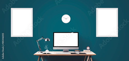 Computer display and office tools on desk. Desktop computer screen isolated. Modern creative workspace background. Front view.