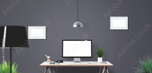 Computer display and office tools on desk. Mockup Scene Creator