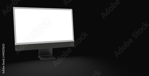 Computer display mock up with blank white screen. Stylish desktop computer mockup. dark