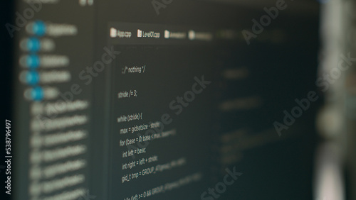 Computer display of software developer typing database functions script on terminal window, cloud computing. Displaying source code and hmtl script with it coding or programming language. Close up.