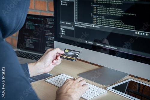 Computer hacker or cyber attack concept, Dangerous hooded hacker using multiple computers typing bad data into online system the access with a virus to infect steal information