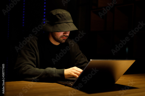 Computer hacker stealing data from a laptop concept for network security, identity theft and computer crime