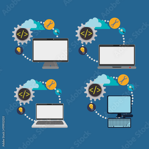 computer laptop cloud gear bulb lupe developer web responsive development website programming icon set. Colorful design. Vector illustration