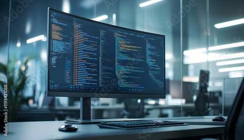 Computer monitor displaying a high-quality coding interface in a sleek, modern workspace