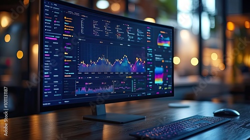computer monitor displaying an abstract network monitoring dashboard with real time data analytics graphs ,system health indicators