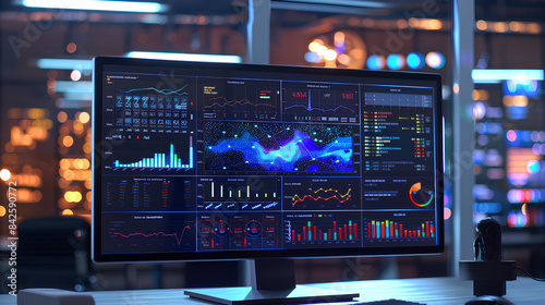 Computer monitor displaying an abstract network monitoring dashboard with real-time data analytics, graphs, and system health indicators