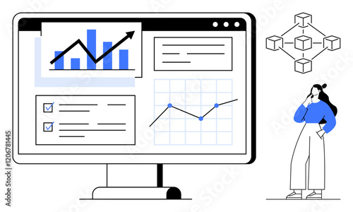 Computer monitor displaying charts, bar graphs, and data analytics. Woman contemplating near blockchain structure. Ideal for data analysis, business strategy, blockchain, finance, technology