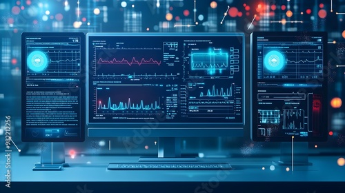 Computer Monitors Displaying Data Analytics, Technology Concept