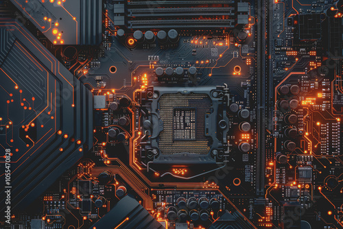 Computer motherboard with complex circuits and microchips focused on technology.