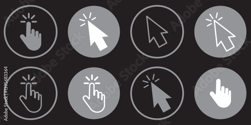 Computer mouse click cursor. Load symbol. Pointer cursor and loading icon. Cursors icons click set. Clicking cursor, pointing hand clicks icons.