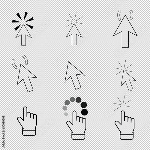 Computer mouse click cursor. Load symbol. Pointer cursor and loading icon. Cursors icons click set. Clicking cursor, pointing hand clicks icons.