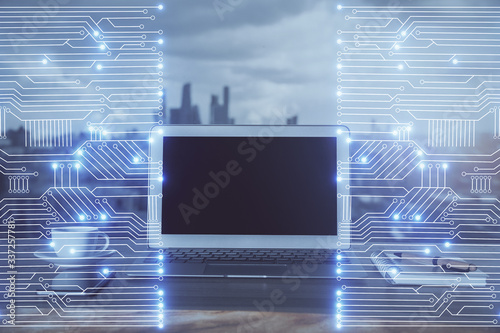 Computer on desktop in office with technology theme hologram. Multi exposure. Tech concept.