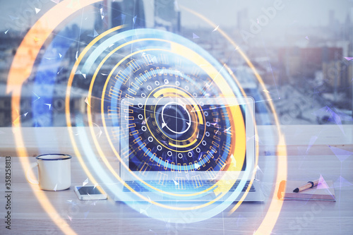 Computer on desktop in office with technology theme hologram. Multi exposure. Tech concept.