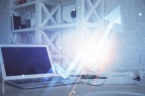 Computer on desktop with point up arrows hologram. Double exposure. Concept of success.