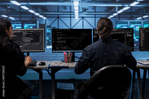 Computer operators in data center running system diagnostic tests to do repairments. IT specialists at PC desk in server room deploying error checking utilities to fix network issues