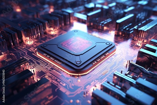Computer processor and motherboard, artificial intelligence, computer brain. AI illustration