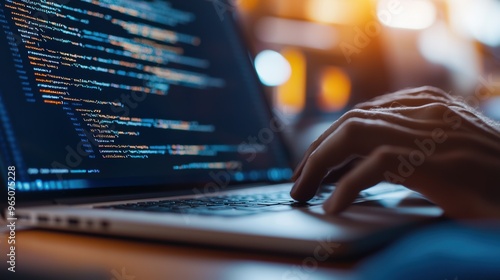 Computer Programmer Coding on Laptop in Illuminated Workspace