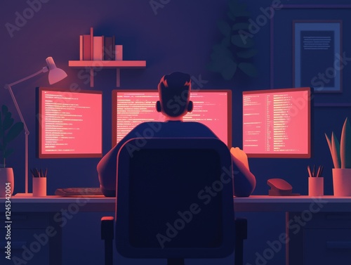 Computer programmer sitting at desk and working late at night on a complex software project using multiple monitors