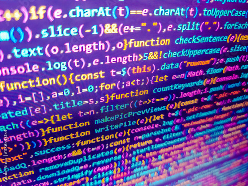 Computer programming source code. Programming code. Programmer monitor with php language code. Web programming with compressed css code. Virtual realtiy. Screen of code for overlay background.