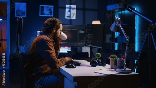 Computer scientist drinking cup of coffee while developing code on PC using java programming languages. IT admin brainstorming ways of fixing database errors, enjoying hot beverage, camera B