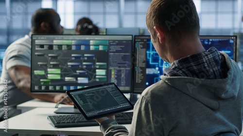 Computer scientist in data center uses artificial intelligence neural networks doing computing processes. IT specialist working on tablet with AI machine learning algorithms, camera A