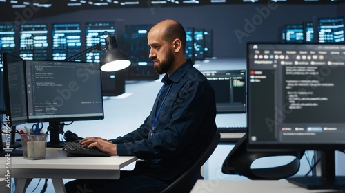 Computer scientist programming in high tech facility with server rows providing computing resources for different workloads. IT programmer overseeing supercomputers tasked with solving data operations