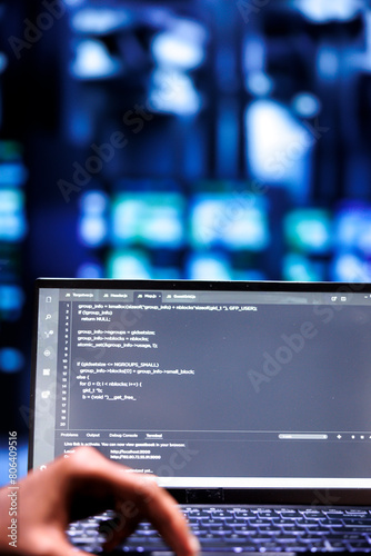 Computer scientists updating rackmounts, writing lines of code on laptop terminal, close up. Employees using JavaScript, Java, and database programming to ensure seamless server farm computing