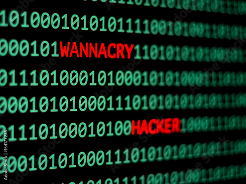 Computer screen shot with binary code and wannacry text, great concept for technology computer and online security