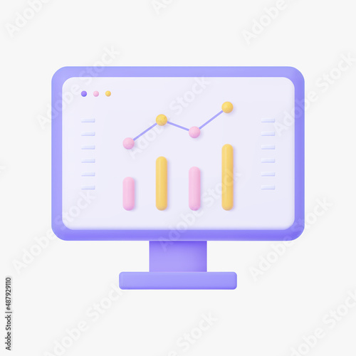 Computer screen with infographic chart 3d vector icon. Isolated on white.