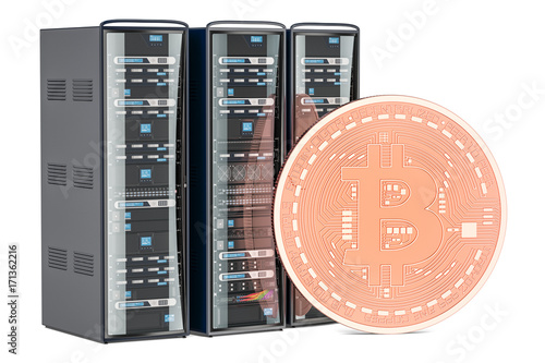 Computer Server Racks with bitcoin, mining concept. 3D rendering