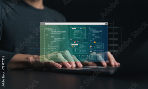Computer software programmer or data engineering coding developer working on datum language. Information transformation development, blockchain database algorithm technology. Website programing design