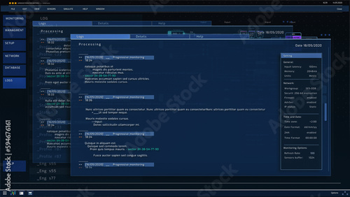 Computer User Interface Showing Infographics, Working Coding Terminal, Cyber Security Checkup, Monitoring Data, Statistics, Analytics and Proper Functioning of Server Database