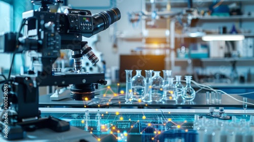 Computer vision technology analyzing images and recognizing patterns in a high-tech lab with copy space
