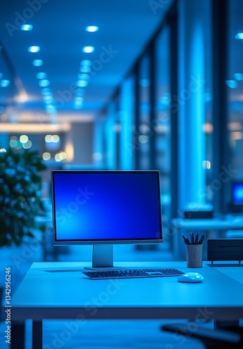 Computer Workstation in Modern Office with Blue Lighting and Blurred Background