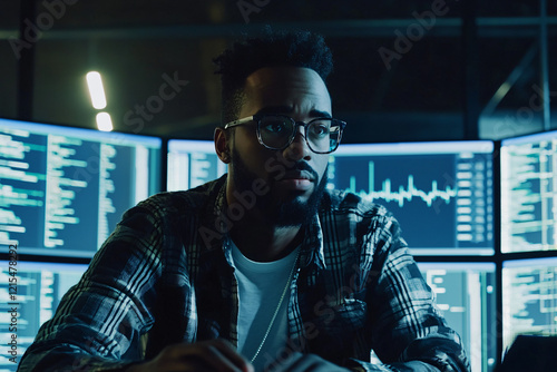 Concentrated IT programmer developing innovative software, multiple screens displaying complex code