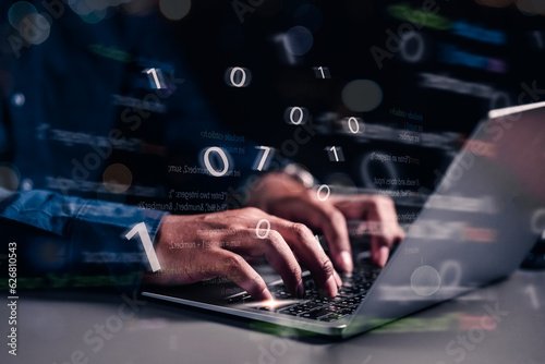 Concept digital and technology, coding, information, software, binary, engineer, development. Typing code and digit number information. Binary engineer development. computer hacking innovation.