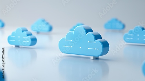 Concept of cloud computing with blue cloud icons spread on a surface, representing digital data storage and internet technology.