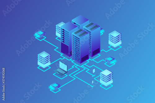Concept of data network management .Vector isometric map with business networking servers computers and devices.Cloud storage data and synchronization of devices.3d isometric style